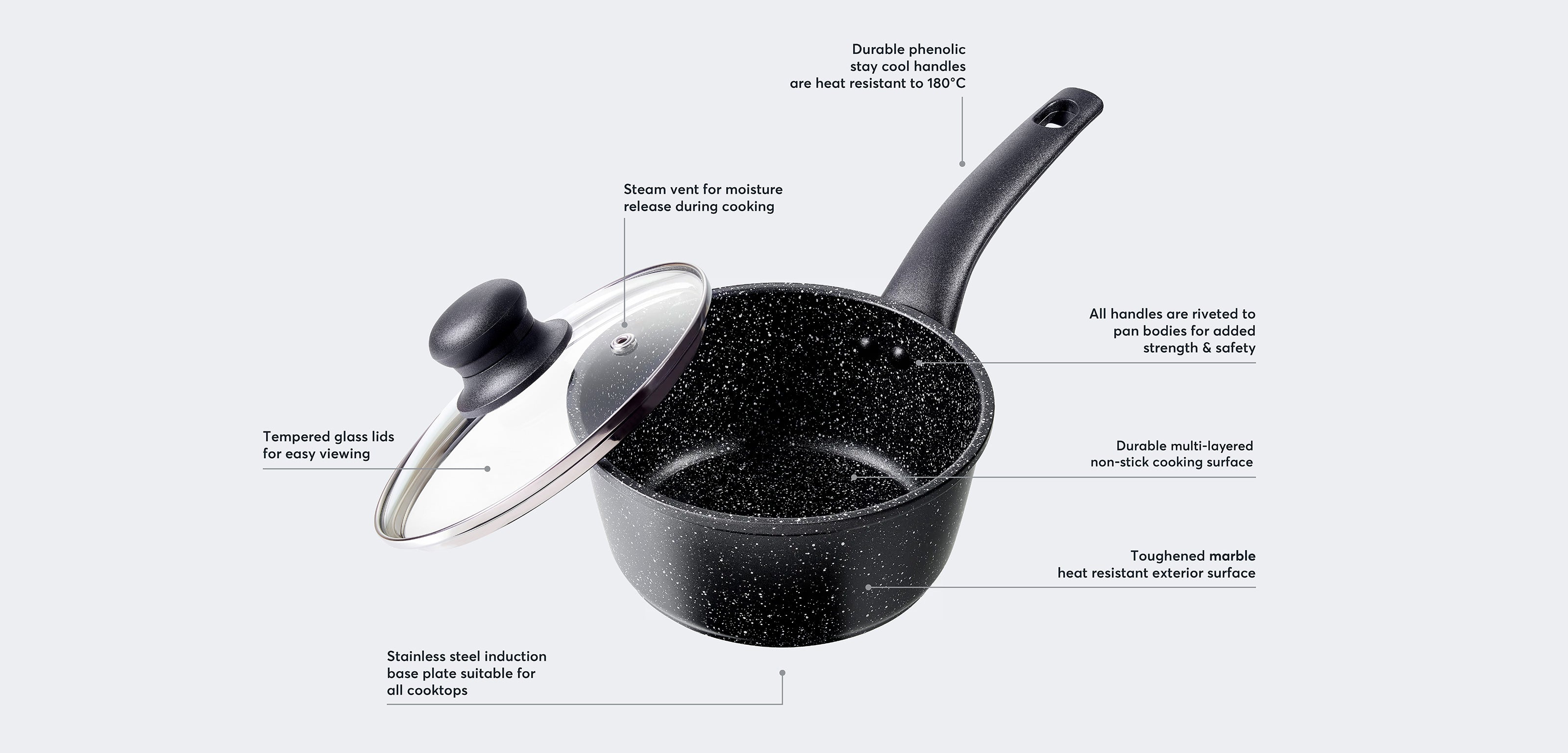 Versatile and practical with functional features including a multi-layered non-stick cooking surface, heat tempered steam vented glass lids, heat resistant handles providing safety and durability, toughened exterior surface and stainless-steel base suitable for all cooktops. Elevate your kitchen with Equip's Marble range. Where style and functionality unite.