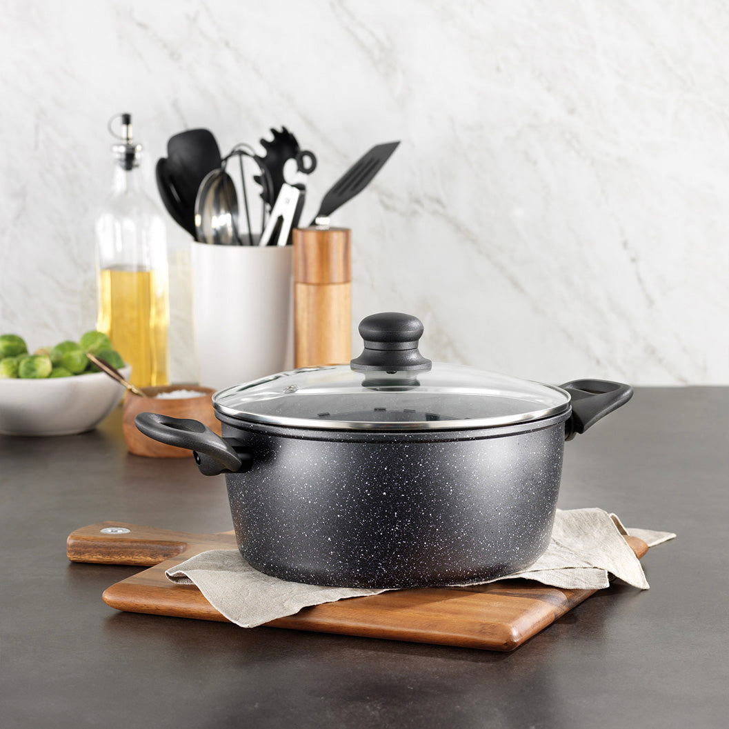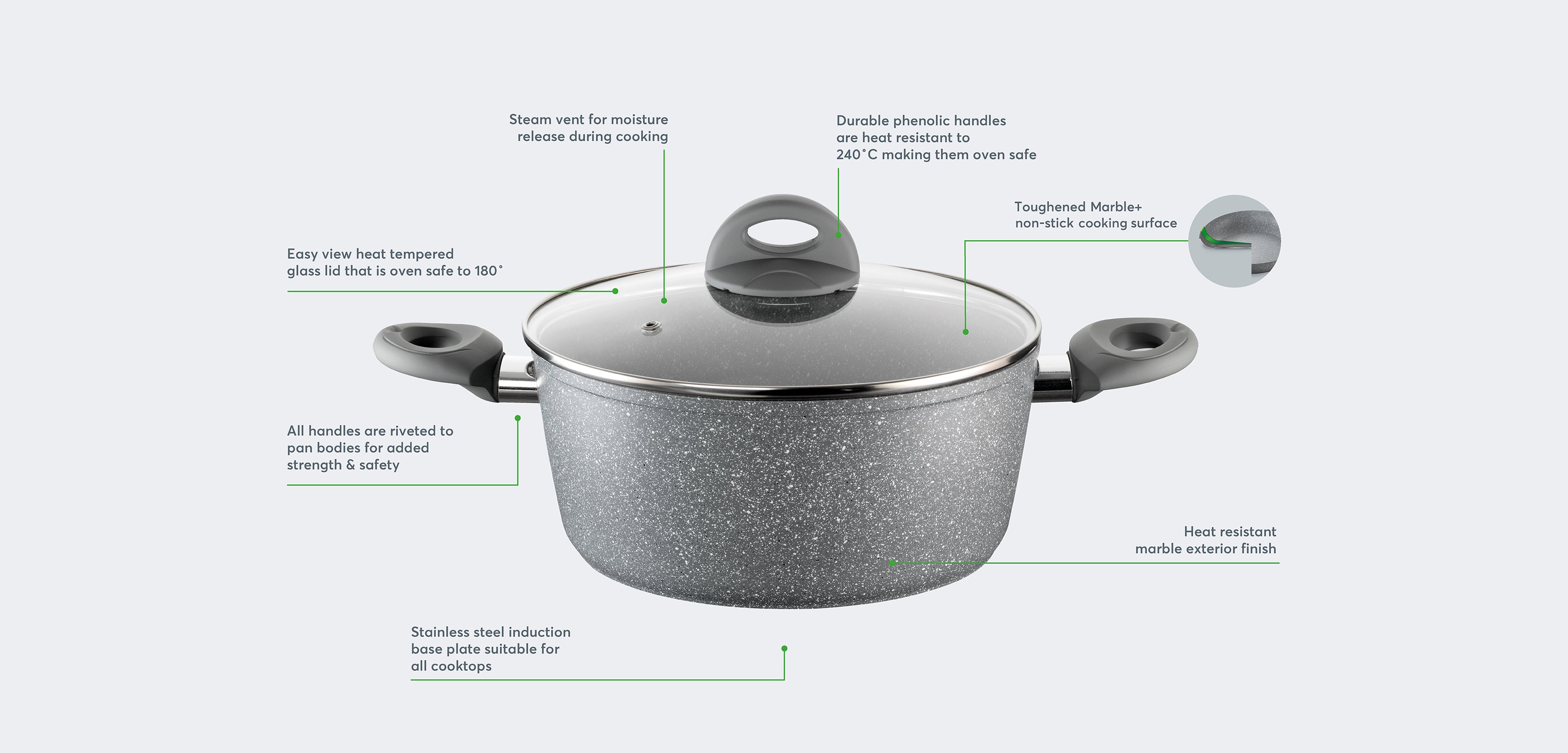 Crafted with precision and featuring the premium forged aluminium core and toughened marble non-stick cooking surface, the Marble+ range maintains the excellence of our singular products. Experience the innovative tech features, including dishwasher-safe convenience, riveted handles, and a stainless-steel induction plate for all cooktops.
