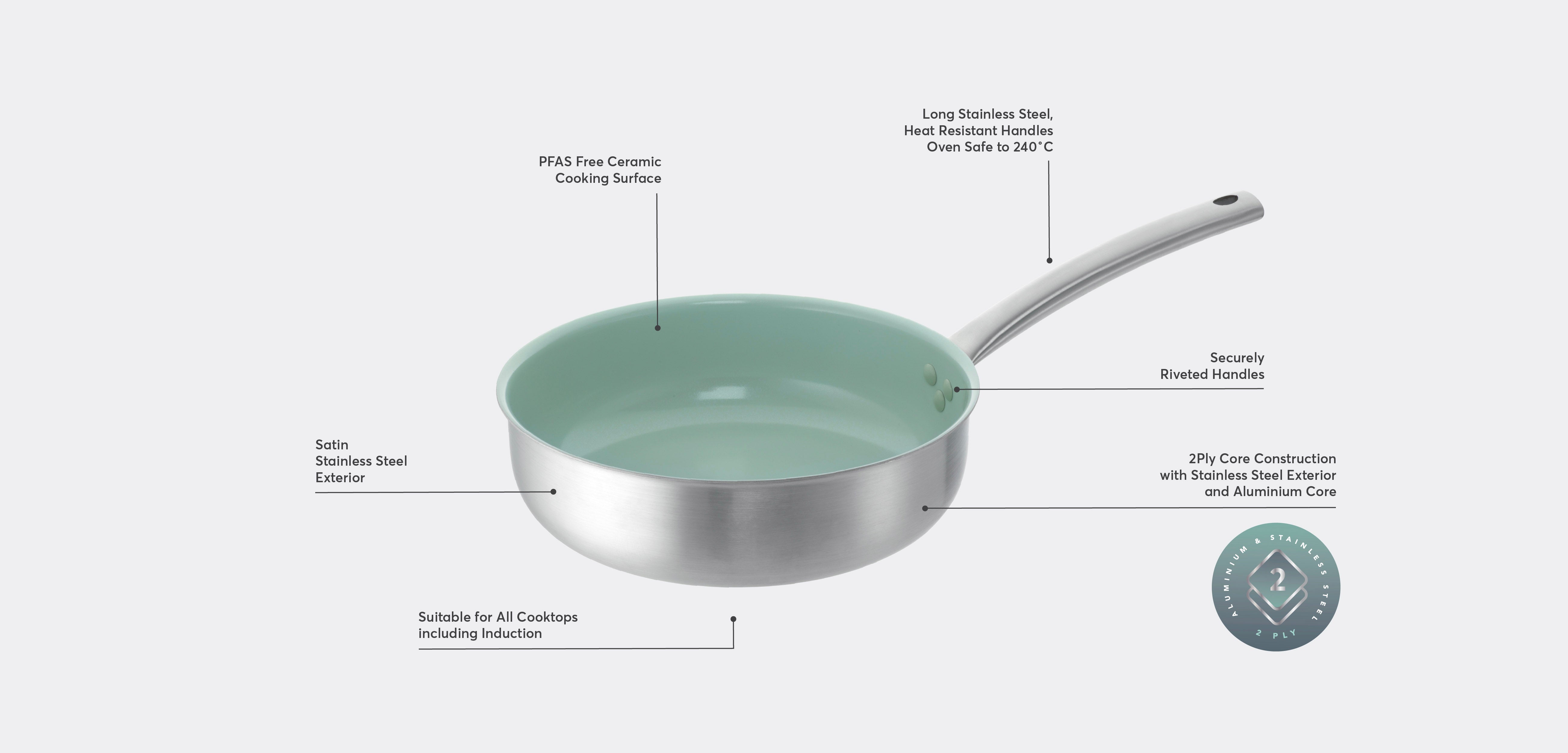 Each piece features a durable 2-ply construction, stainless steel bonded over an aluminium core for fast, even heat distribution and long-lasting strength. The PFAS-free ceramic cooking surface is naturally non-stick, smooth, and effortless to clean, making everyday cooking both easy and safe.